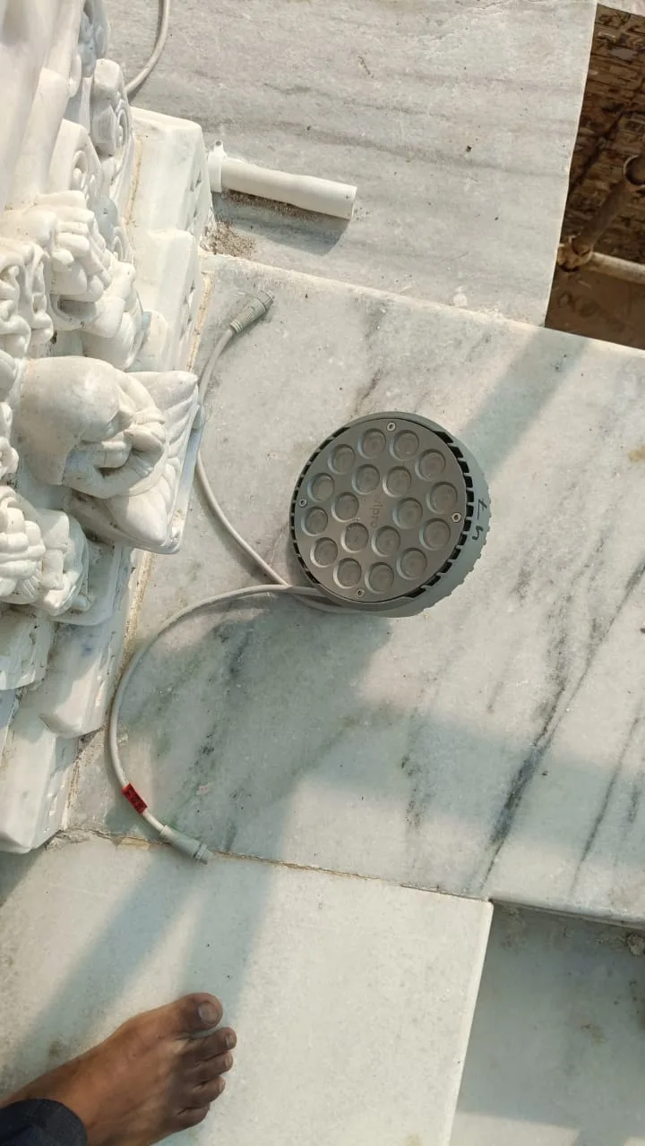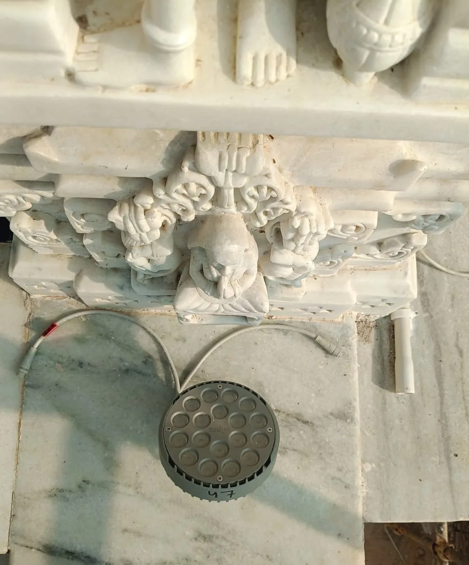 The primary intervention involved the installation of architectural lighting on the main mandir building. Lighting was designed to emphasise form, elevation, and detail without overpowering the sanctity of the structure. The intent was not spectacle, but reverence allowing the temple to remain visually prominent during evening hours while maintaining a calm and respectful atmosphere.